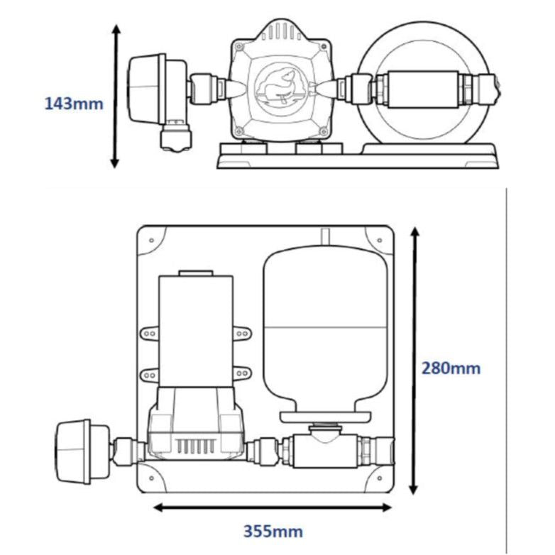 - Combined pump and accumulator tank ensures a smooth even flow of water to all outlets