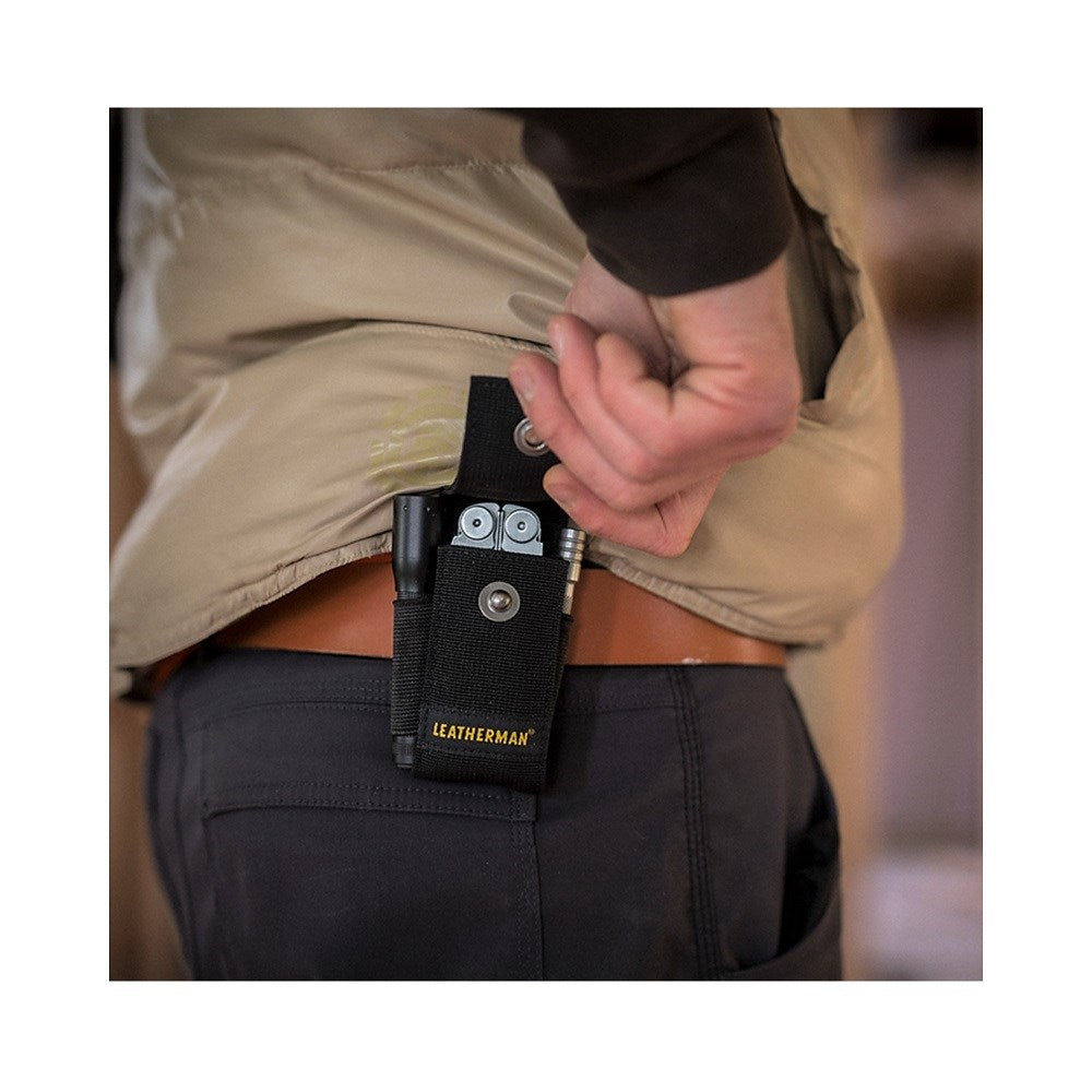 Protect your multi-tool with these redesigned Leatherman Nylon Sheaths. Every detail has been thought through to ensure these Sheaths are long-lasting, dependable and easy to use. A high-grade metal rivet snap closes tightly and keeps your tool secure. They are made out of durable, ballistic nylon and elastic with reinforced stitching for improved accessibility and fit. The extra pockets in this Nylon Sheath were crafted to carry a Bit Kit, Bit Extender, and small flashlight or marker style pen. Overall fit may vary depending on accessories carried. Fits 4.5 cm (1.75") wide belt and smaller.